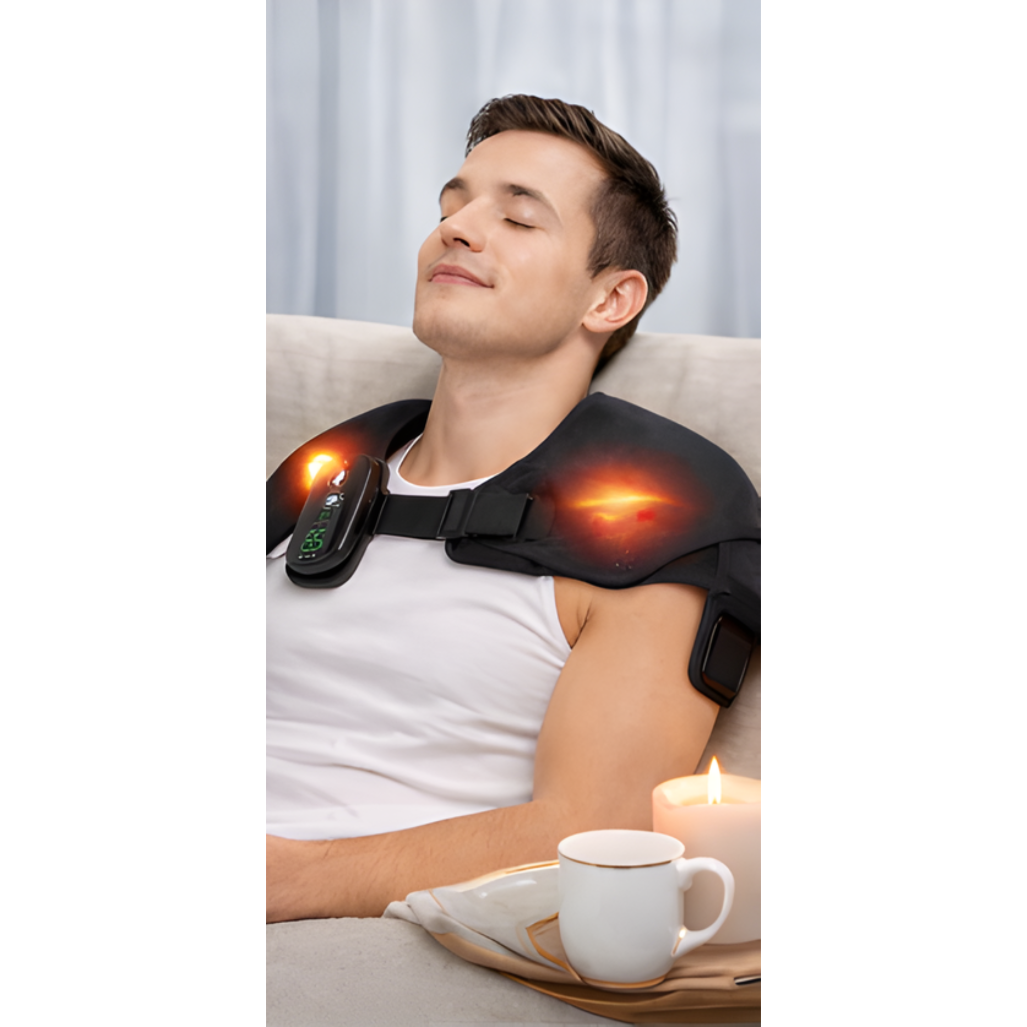 Su diseño ergonómico envuelve perfectamente los hombros permitiendo una presión uniforme y cómoda. El sistema de calor regulable se adapta a diferentes niveles de sensibilidad.